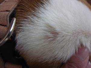 Case 02 ニキビダニ症 2014年7月30日2019年12月14日 首の皮膚に、発赤と脱毛を伴なう皮膚炎形成を認める。 皮膚掻爬検査(皮膚を少し削る検査)を実施。多数のニキビダニ寄生を認める。 治療開始から約1ヶ月後。かなり発毛が進んでおり良好な経過をたどっている。
