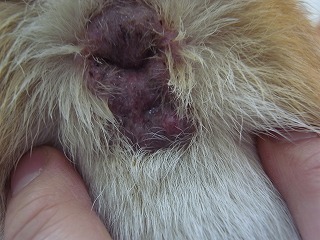 肛門周囲に腫瘤の形成を認める(時計で5時の位置)。