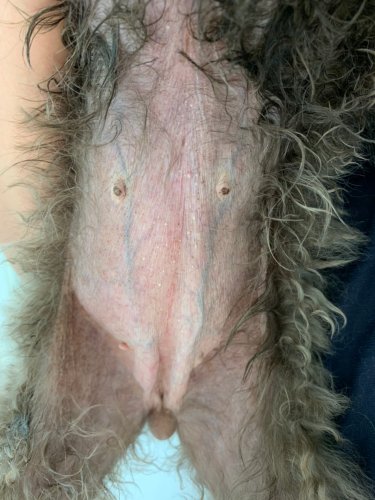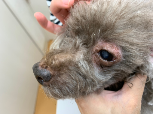 既に重度ステロイド皮膚症が認められ、アポキルで落ち着いているが時々悪化する状態でした。
