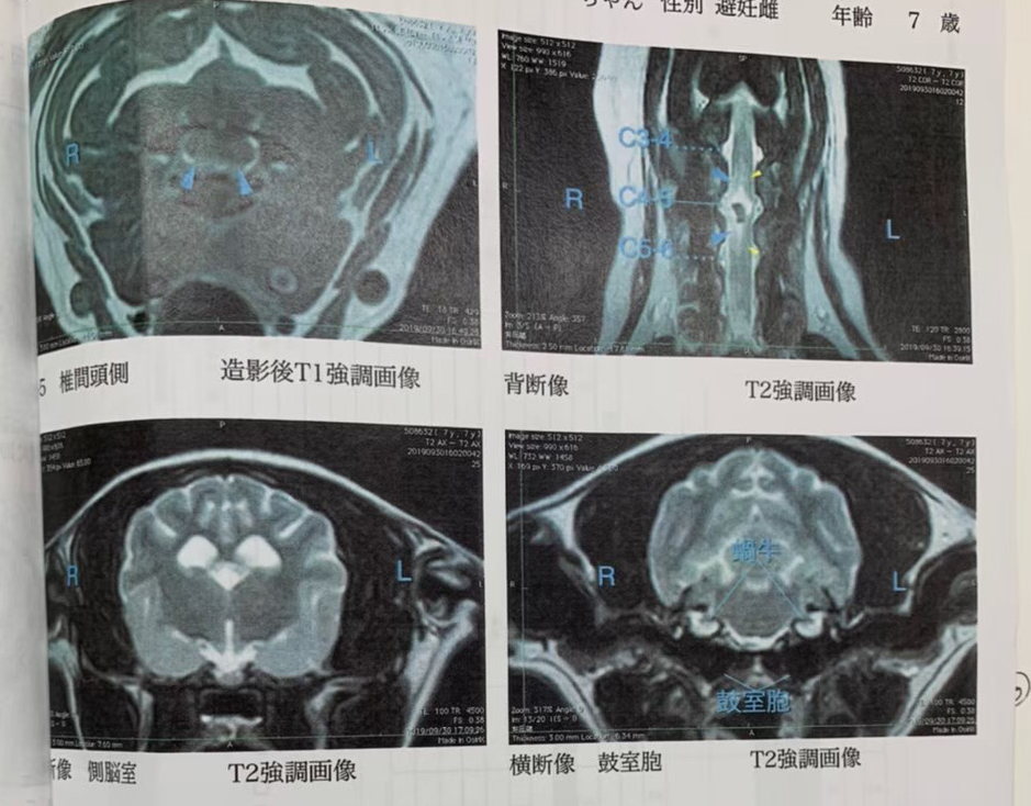 結果より頸部椎間板ヘルニアが確定され、 外科的治療である腹側減圧術(ベントラルスロット術)を実施
