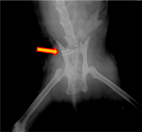 猫が交通事故に巻き込まれると骨盤を骨折することが多く、本症例も交通事故に巻き込まれた可能性があります。