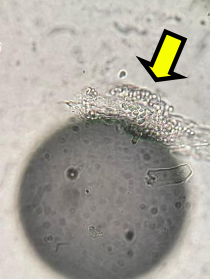ウッド灯検査で光った毛を抜き、顕微鏡で観察したところ、写真の矢印で示すカビの分節 分生子が確認されました。