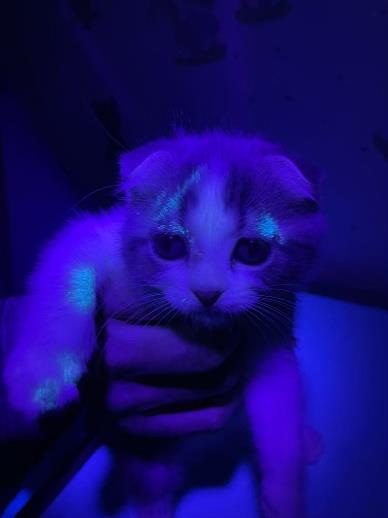 見た目から真菌(カビ)の感染が疑われたため、ウッド灯検査という特殊な波長の光をあて る検査を行いました。この検査ではカビが感染した毛が青緑色に光ることで診断の補助に なります。