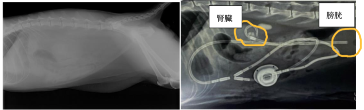 尿管が閉塞する原因として、結石や腫瘍性のものが疑われますが、ここまでの検査では確実な原因が特定できなかったため、原因を確かめるためには追加でCT検査を行うのが理想です。ただ今回の猫ちゃんは状態が悪く検査までの時間や検査のための麻酔による負担が大きくなってしまう可能性が高いため、応急的に、皮膚から腎臓に入れる、尿を排出させる管(腎瘻チューブ)を設置し、本人の状態を持ち上げる処置が行われました。