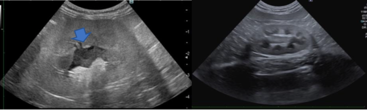 左:腫大し腎盂(青矢印、腎臓の中の尿が通る部分)が拡張した左腎、右:正常な腎臓