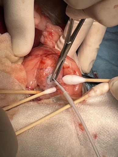 その結果、数日で猫ちゃんの元気が麻酔に耐えられる程度に回復してきたため、次に尿管とは別に、腎臓から膀胱への通り道を新たに設置する手術を行います。尿管閉塞の場合、外科的な治療になることが多く、いくつか方法はありますが、今回はSUBシステムというものを用いました。