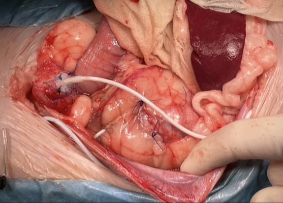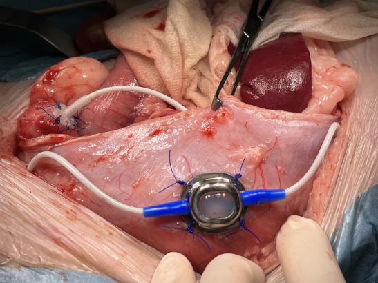 腎臓と膀胱に固定した2本のカテーテルをポートという金属の部品で連結させ、皮下で固定し、お腹を閉じて手術が終了となります。