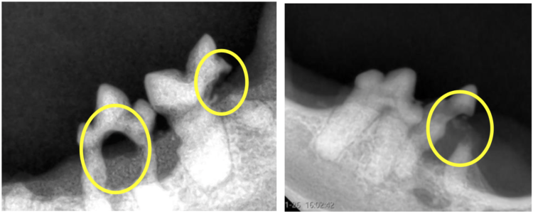 全身麻酔をかけた状態での口腔内のレントゲン撮影で、欠損歯や吸収病巣が確認されました。