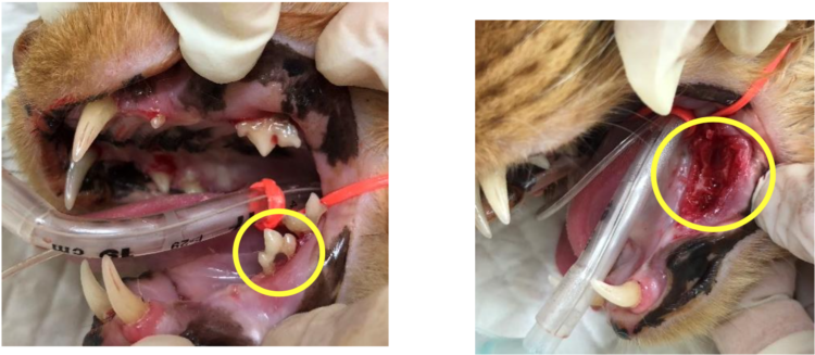 今回の症例では、レントゲン検査などで分かった重度に吸収されている歯を抜歯。