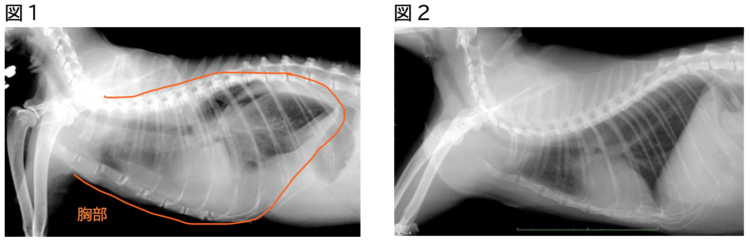 図 1 はこの子のレントゲン画像です。図 2 は正常な猫のレントゲン画像です。