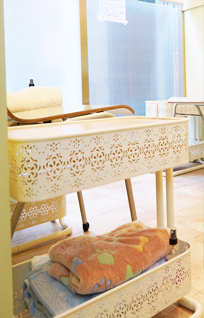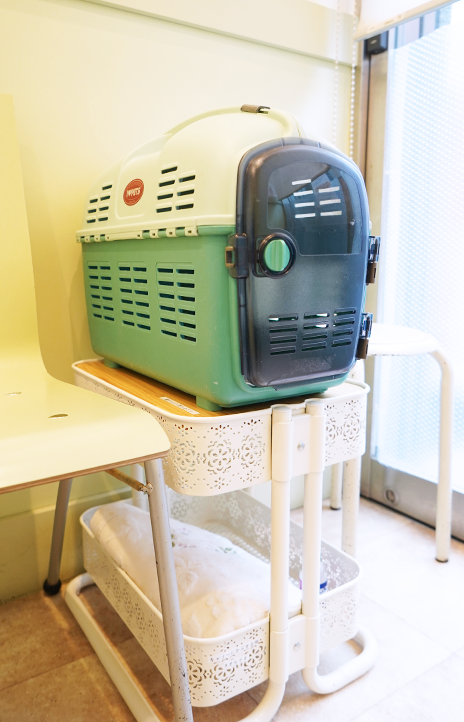 猫専用待合室には、飼い主様にお座り頂く全ての椅子の横に、猫ちゃんのキャリーバッグを置くためのワゴンを設置しております。